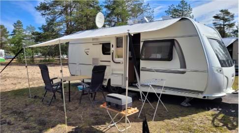 Anstelle einer Sackmarkise oder einer Kassettenmarkise nutzen wir ein Sonnensegel, welches insgesamt nur 6kg wiegt und fast immer mit dabei ist. Dieses ist sehr schnell auf und wieder abgebaut und zur Not auch nass verstaut.
